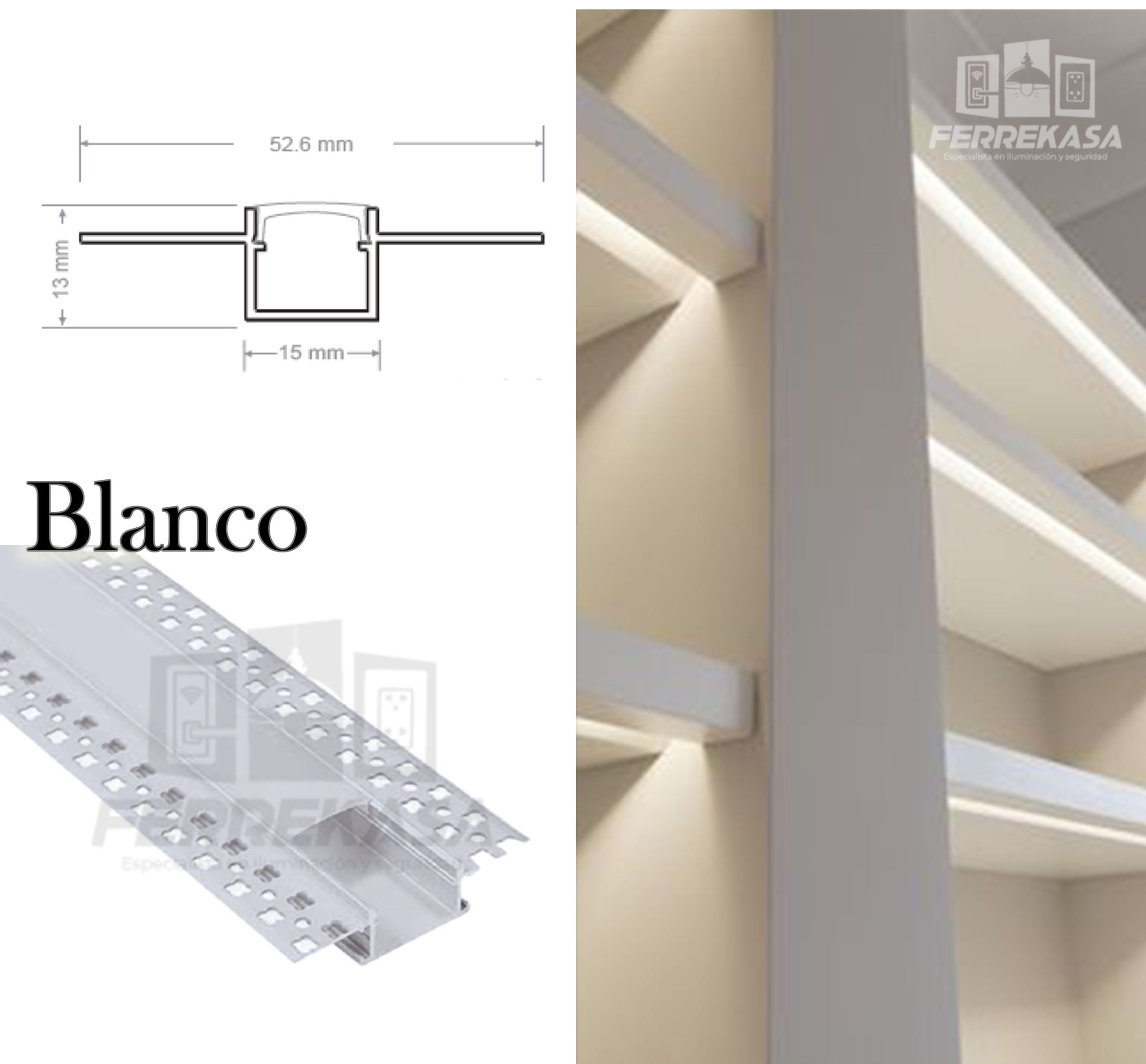 Perfil Empotrado Para Drywall 52.6 x 13 x 15 mm Para Cinta Led